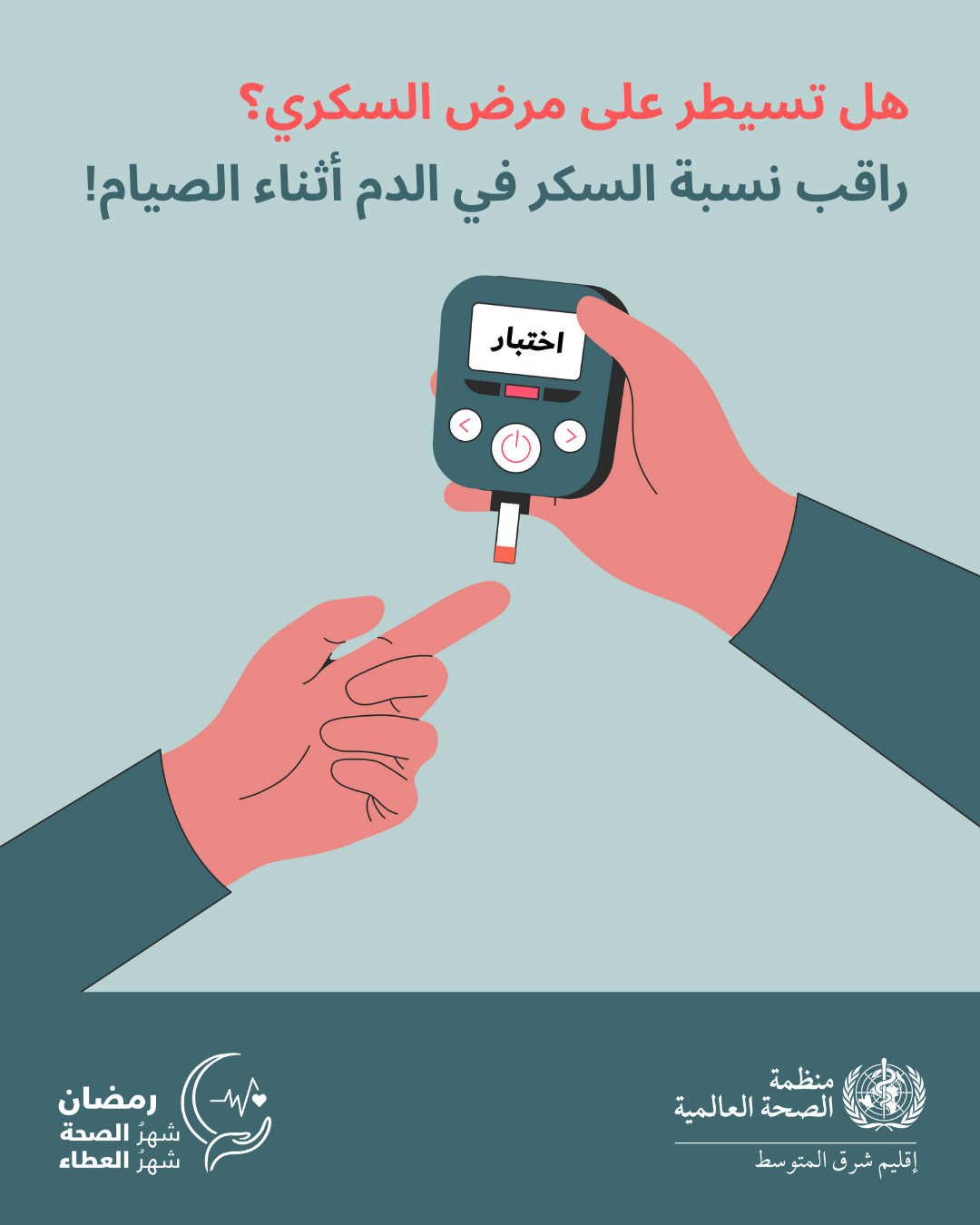 - قياس السكر بانتظام، حتى أثناء الصيام، وعمل اللازم فورًا للتعامل مع أي انخفاض أو ارتفاع في السكر؛