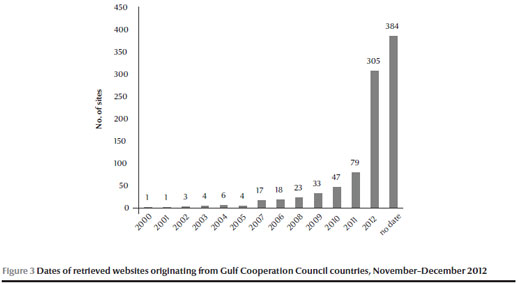 e-health is an umbrella term for health information delivered over electronic networks. It includes information and data for health-care professionals as well as public health information, which is also known as Internet health or web health (the focus of this study). Internet health information is growing at a fast pace in the 6 Gulf Cooperation Council (GCC) countries—Bahrain, Kuwait, Oman, Qatar, Saudi Arabia and United Arab Emirates (UAE). In 2006, Al Shorbaji recorded only 258 medical and health-related sites in the 22 countries of the World Health Organization Eastern Mediterranean Region (EMR), which includes the Gulf countries: he later located 335 sites in 2008, an increase of 29.8% (1). For this study in 2012, which is the first comprehensive overview of Internet health information in the GCC, more than 1200 websites were initially identified. The increase can be attributed to several factors: governments’ development of information and communications technology in general, including e-learning, e-health and e-governance, as part of Gulf economic diversification strategies (knowledge economies); progress in medical education, biomedical research and health informatics programmes and associations in the region; growing health consumerism by the public due to rising levels of educational attainment; and increasing use of the Internet in the region in general (e.g. by 2008–09 Qatar and the UAE were categorized by the International Telecommunication Union as Internet “highly penetrated countries”) (2).