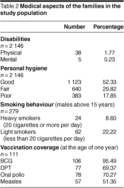 The birth rate in the study population was 156 (47.82 per 1 000 population as compared to 43.2 for the entire country). A higher birth rate in the reference population may be due to low literacy, early marriage and traditional customs and habits. The crude death rate was 6.06 per 1 000 population as compared to 4.60 [2] for the country. The infant mortality rate was 32.05 per 1 000 live births, similar to the national infant mortality rate of 32.8 [2]. The stillbirth rate was lower than the national figure; this may reflect the better antenatal care provided in the study community. The abortion rate of 19.18 per 1 000 females of reproductive age was similar to that reported by other investigators [14].