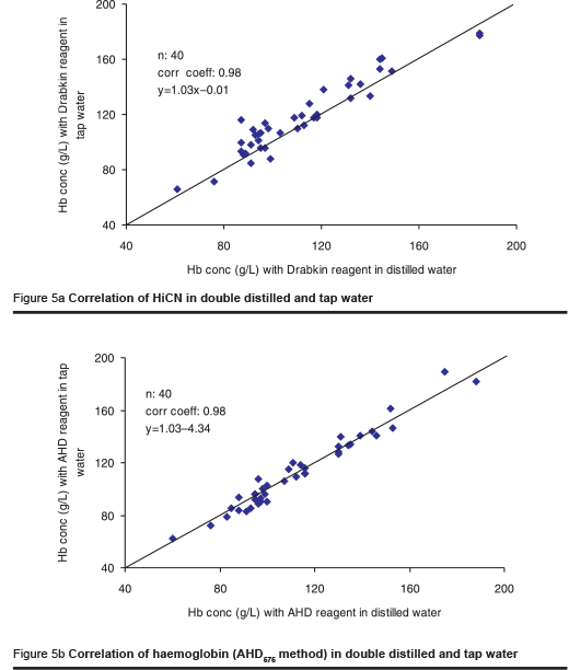 As the availability of distilled water may often be limited, one laboratory investigated the effect of tap water and river water on the HiCN and the AHD575 methods. The river water was filtered using a rather primitive technique to remove microparticles. The osmolality of the tap water and the river water was 10 mOsmol/kg and 11 mOsmol/kg respectively. The tap water and the filtered river water were used for the preparation of the AHD reagent. Measurement was made in 2 series, each including 40 blood samples.