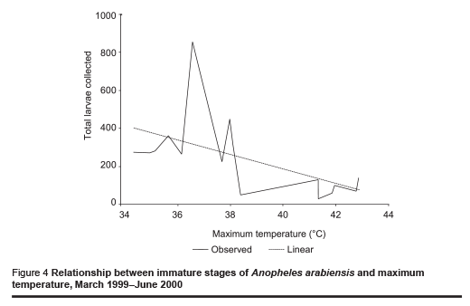 Clearly, the breeding activity of A. arabiensis in this area is governed by both rainfall and periods of crop irrigation, and has now become perennial rather than seasonal as a result of the latter, and at no time during the year did the temperature go above or fall below the optimum range of the mosquito [25].