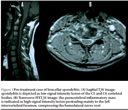 Cervical spondylitis should be considered a severe complication of brucellosis; therefore its treatment and follow-up must be energetic in order to detect and correct as early as possible compressions of the neural axis and its roots. Treatment should be prolonged to prevent both complications and relapses. Further evaluation in controlled studies is needed to assess the efficacy and safety of treatment options in brucellar spondylitis.