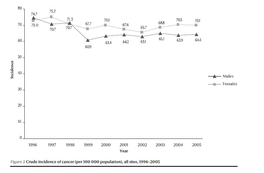 Figure 4 shows the ASRs for all cancers in males and females. The overall average ASRs for all cancers were 119 per 100 000 adult males and 116 per 100 000 adult females (Table 3). The median age at diagnosis was 56 years for males and 53 years for females. By site of cancer the ASRs per 100 000 population for lung cancer were 16.3 and 3.6 per 100 000 in males and females respectively and for colorectal cancer were 20.1 and 14.6 per 100 000 respectively. The ASR for breast cancer was 39.9 per 100 000 females.