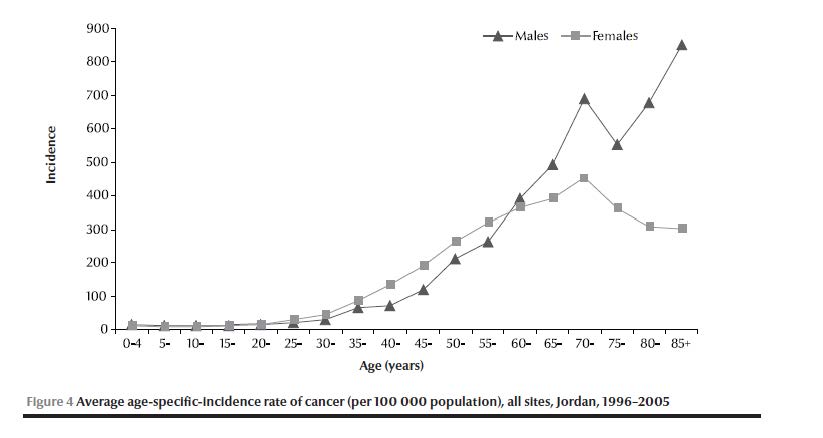 The implementation of different strategies for the control and prevention of many communicable diseases of childhood, along with rapid improvements in socioeconomic status and improvements in health services in Jordan have led to the emergence of noncommunicable diseases as the dominant source of ill health. Cancer is the second leading cause of death in the country.