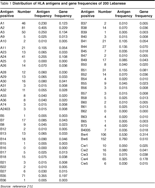 Only two studies have been reported on Lebanese expatriates living in either Australia or the United States of America [1,2], and there have been a few reports about different Arab communities, mainly in Egypt [3-6] and Israel [7]. Beside these, there have been no published studies on the HLA profiles of the Lebanese and their immediate Arab neighbours. In this work, we describe antigen and gene frequencies of the A, B and C loci of the major histocompatibility (MHC) class I gene in a sample of 200 healthy Lebanese individuals. The results, including the haplotypes and linkage disequilibria, are compared to patterns reported for other populations in the world.