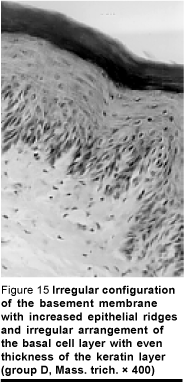 Group D. Increased epithelial thickness was noticed with a marked increase of clear cells reaching the granular cell layer. The keratin layer appeared homogeneous with increased thickness (Figure 13). Early keratinization was evident near the prickle cell layer which obscured the granular layer (Figure 14). As a result of the increased mitotic figures at the basal cell layer, irregular configuration of the basement membrane with lateral extensions of the epithelial ridges gave rise to the drop-shaped appearance seen (Figures 14 and 15).