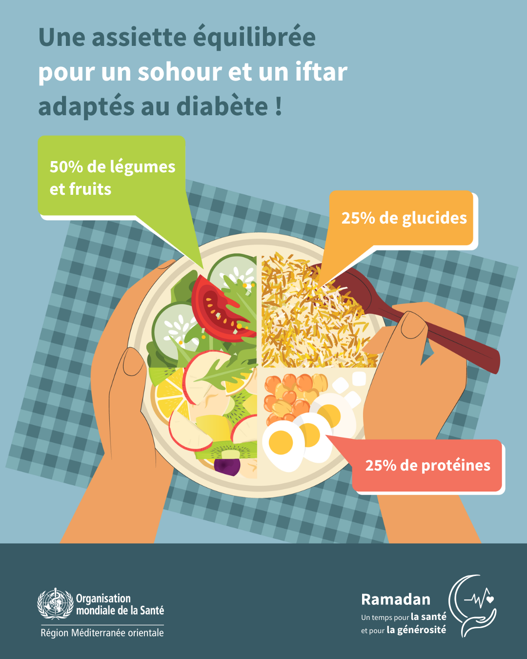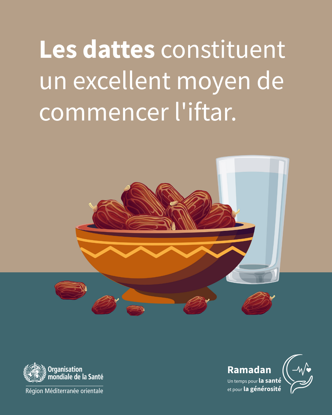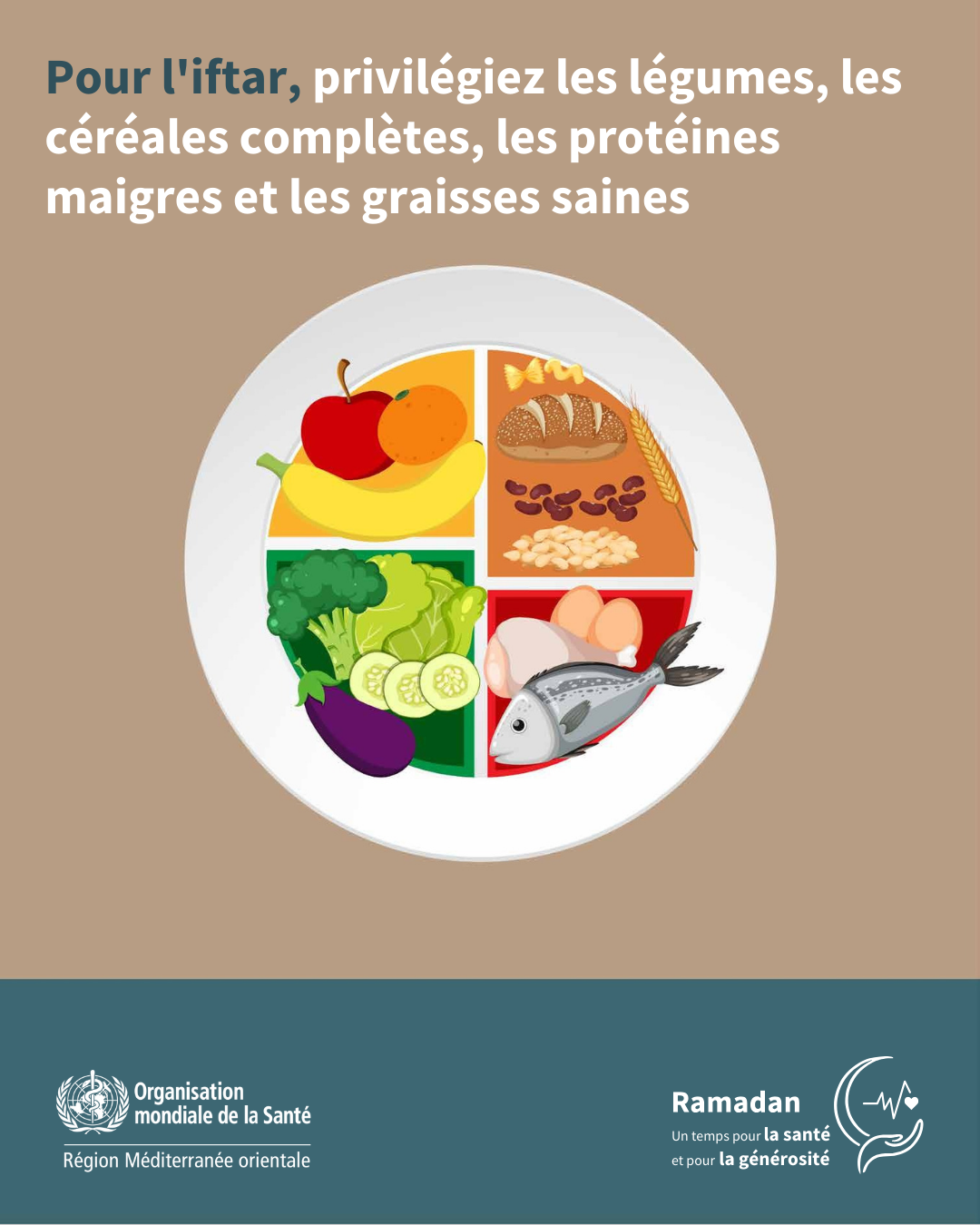 - de veiller à ce que les repas de l’Iftar et du Sohour soient sains, équilibrés et contiennent tous les nutriments nécessaires, notamment des glucides, des protéines végétales et/ou animales, des vitamines et des sels minéraux ;