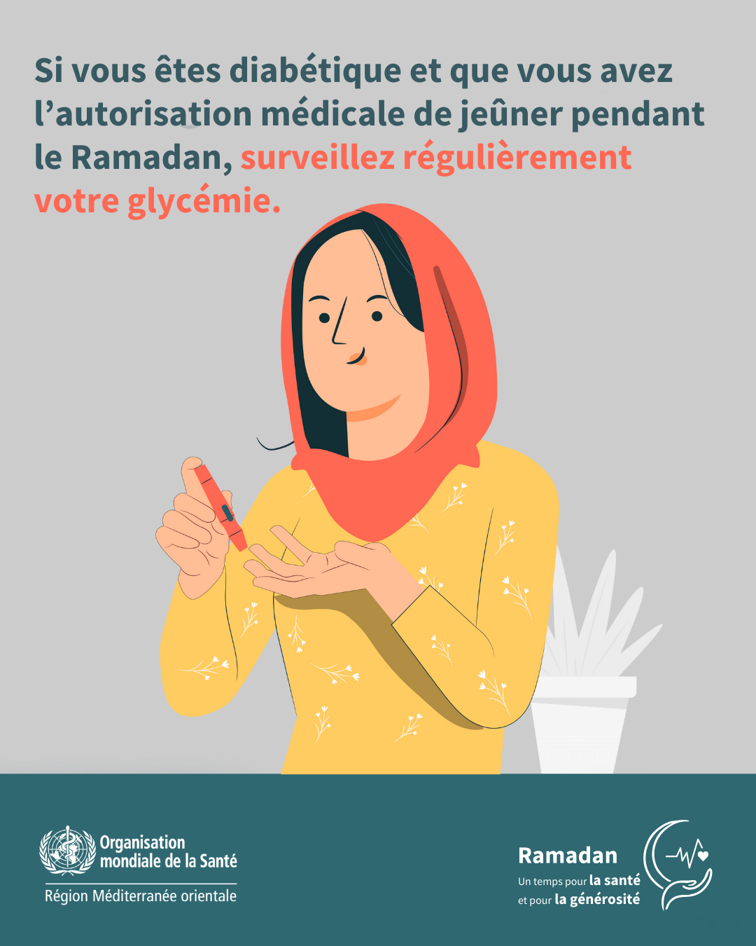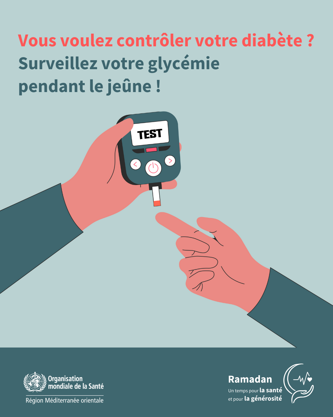 - mesurer régulièrement leur glycémie, pendant le jeûne et après la rupture du jeûne, et réagir immédiatement en cas d’hypoglycémie ou d’hyperglycémie ;