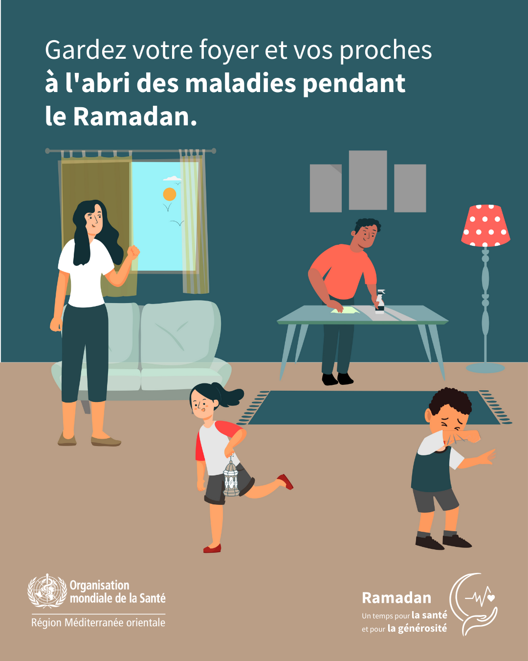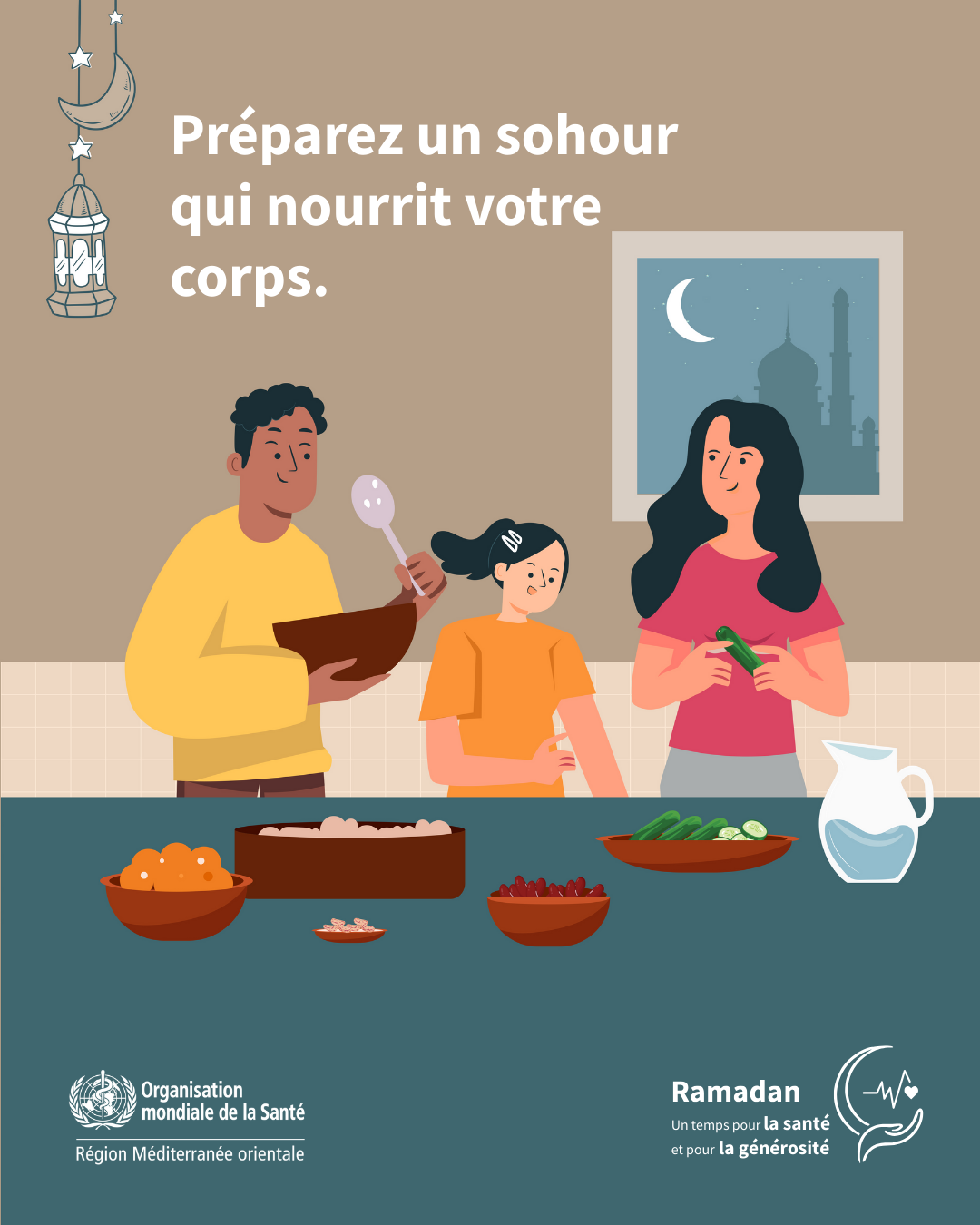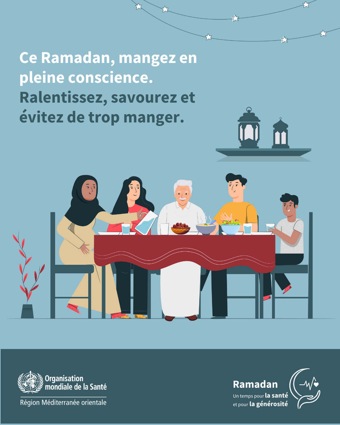 Le Ramadan est une excellente occasion pour les personnes de se retrouver, de partager des moments de qualité et de prier ensemble. Rester en bonne santé, malgré la proximité et l’augmentation des interactions, nous permet de mieux profiter de ces rassemblements. Adoptons de bonnes habitudes pour rester en forme pendant et après le Ramadan. Voici trois messages clés à retenir :