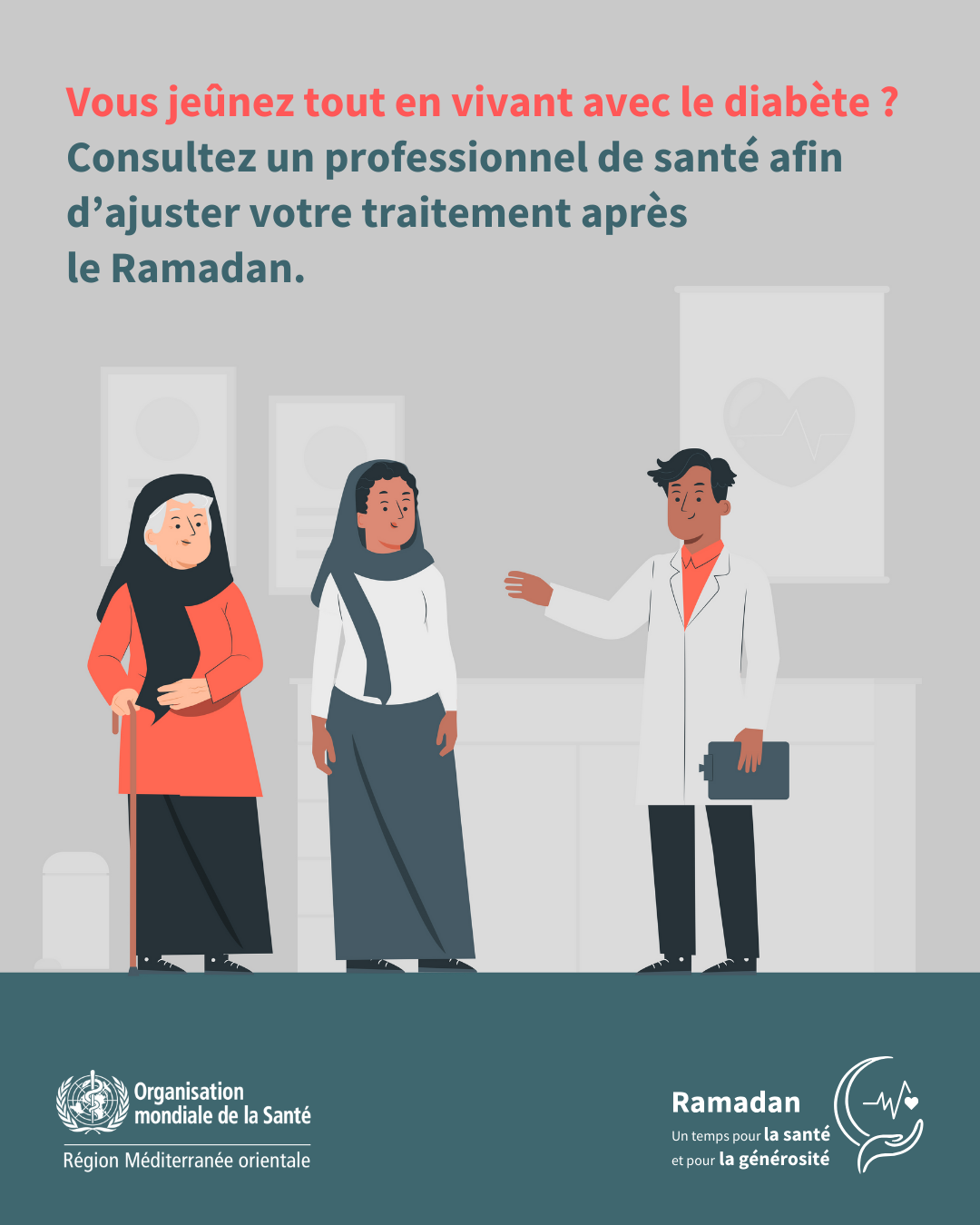 - consulter un médecin avant le Ramadan afin d’élaborer un plan de jeûne en toute sécurité ou de déterminer des options alimentaires adaptées ;