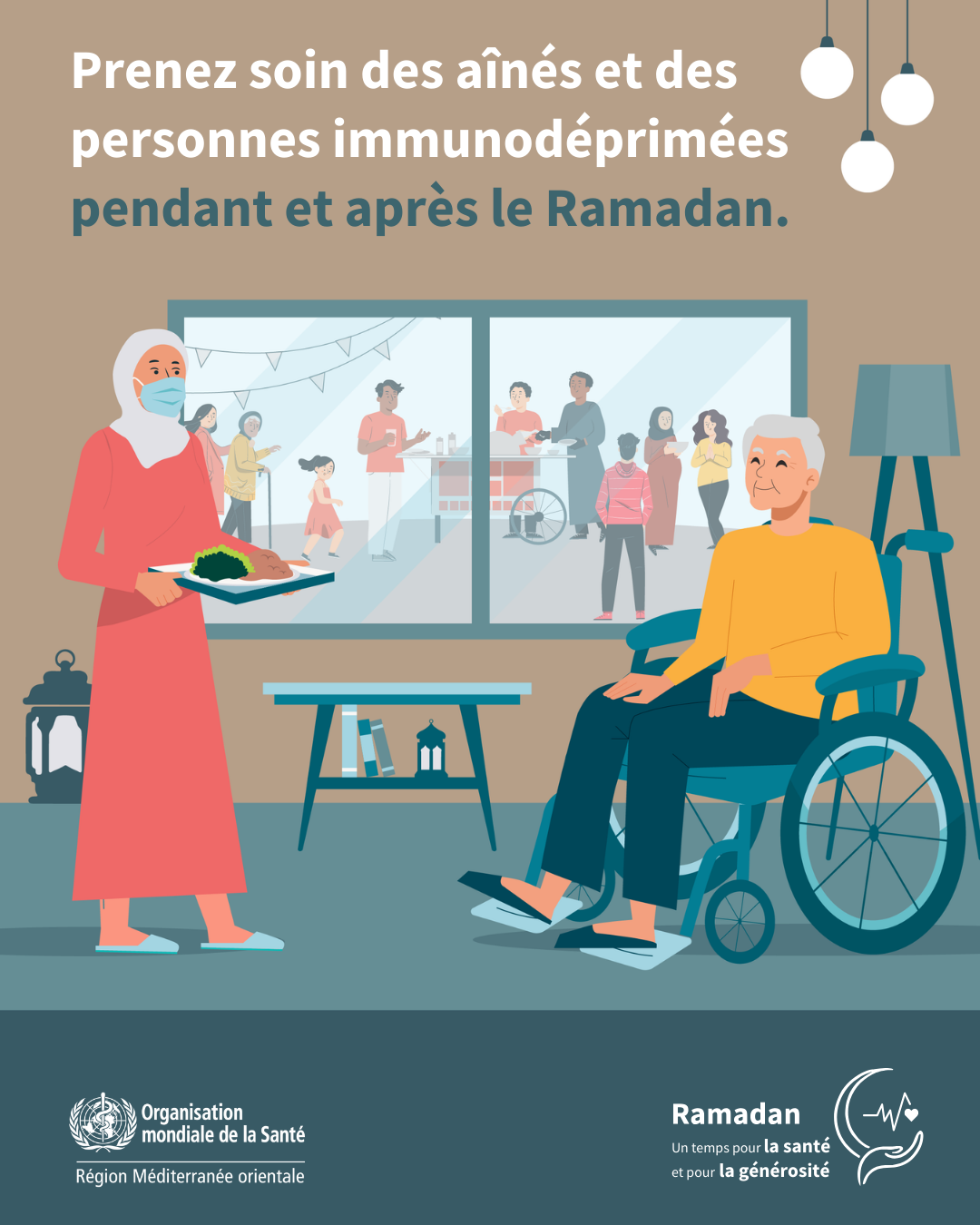 - 2. Saviez-vous que les personnes âgées, les femmes enceintes et les personnes ayant une immunité affaiblie sont plus exposées aux infections respiratoires ? Veillez à ce que le Ramadan se déroule en toute sécurité pour tous en adoptant les bons gestes afin de limiter la propagation des germes :