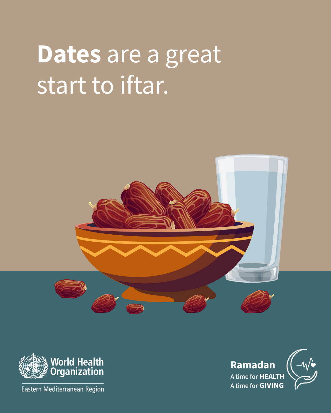 ensure Iftar and Suhoor meals are healthy and balanced and contain all necessary nutrients, including carbohydrates, plant and/or animal protein, vitamins and mineral salts;