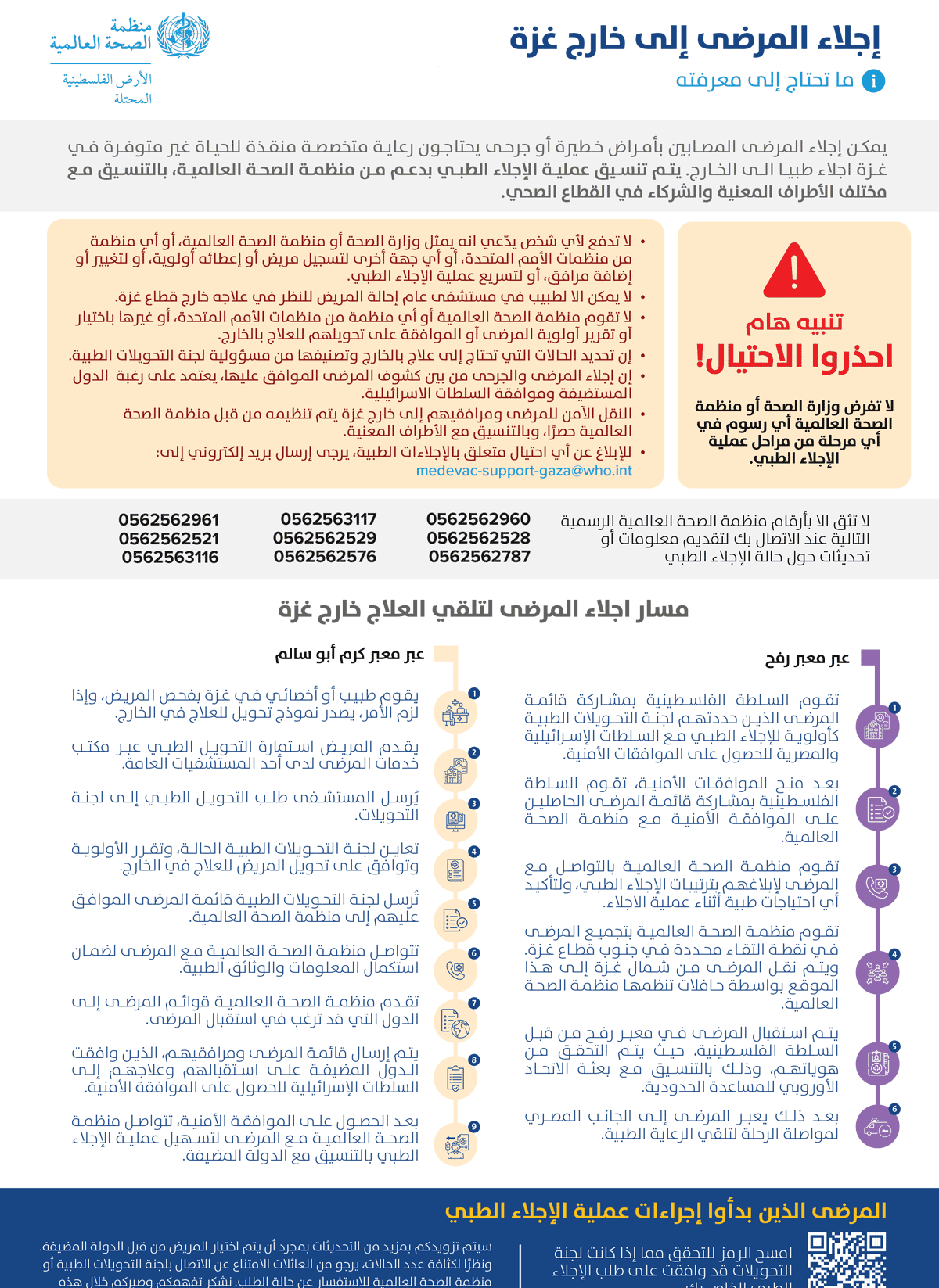 The medical evacuation process supported by WHO. The safe transfer of patients and their companions to medical evacuation collection points within the Gaza Strip, and their movement outside the Strip, is carried out by WHO in coordination with the relevant Palestinian and Israeli authorities.