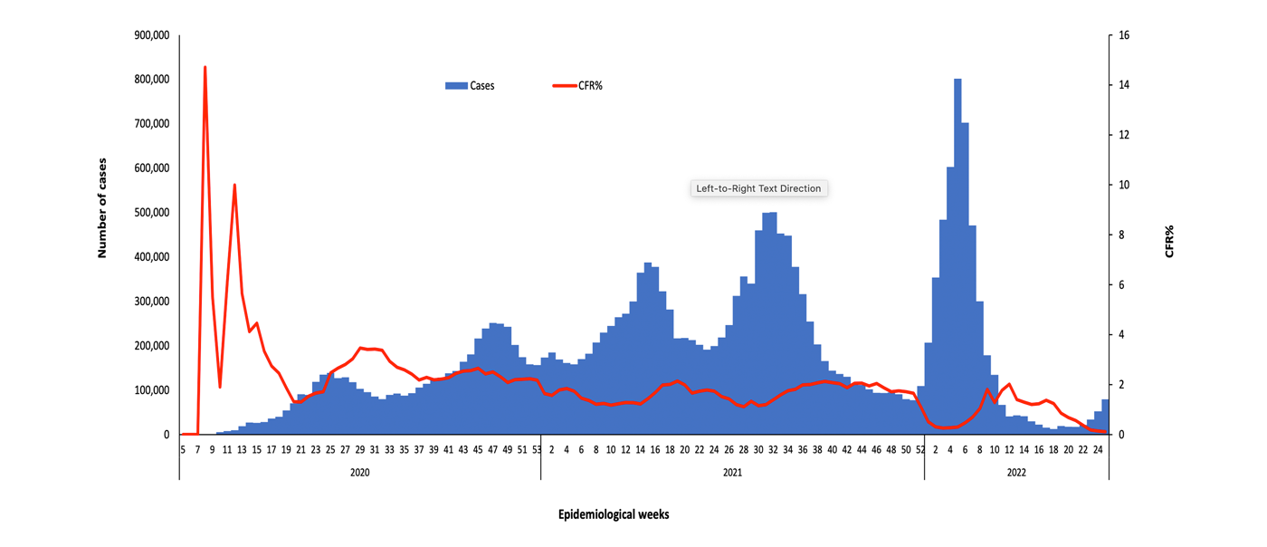 The coronavirus disease COVID-19 continues to spread at the regional and global levels. As of 25 June 2022, the global cumulative incidence reached 541 106 411 reported cases and 6 339 033 associated deaths at a case-fatality ratio (CFR) of 1.17%. Meanwhile, the 22 countries of the Eastern Mediterranean Region (EMR) have reported a total of 21 957 162 cases, representing about 4.06% of the global count, with 343 509 associated deaths (CFR 1.56%). Most countries in the Region are in the community transmission phase.
