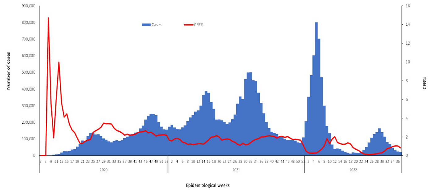 The coronavirus disease COVID-19 continues to spread at the regional and global levels. As of 17 September 2022, the global cumulative incidence reached 608 804 714 reported cases and 6 516 488 associated deaths at a case-fatality ratio (CFR) of 1.07%. Meanwhile, the 22 countries of the Eastern Mediterranean Region (EMR) have reported a total of 23 049 848 cases, representing about 3.79% of the global count, with 348 172 associated deaths (CFR 1.51%). Most countries in the Region are in the community transmission phase.