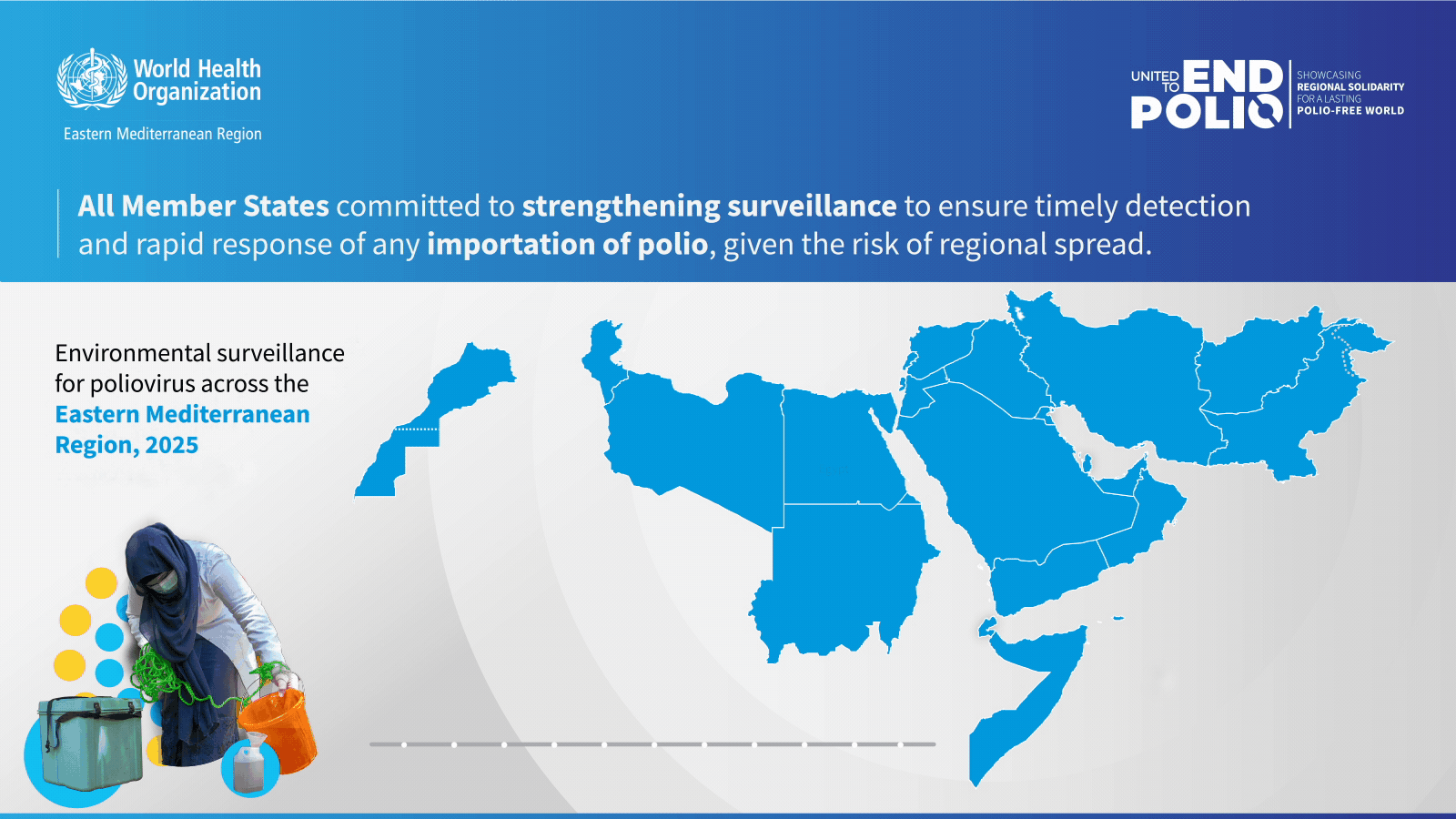 The United to End Polio campaign highlights national efforts across the Eastern Mediterranean Region. Member States share their stories and engage through the Secretariat of the Regional Subcommittee for Polio Eradication and Outbreaks.